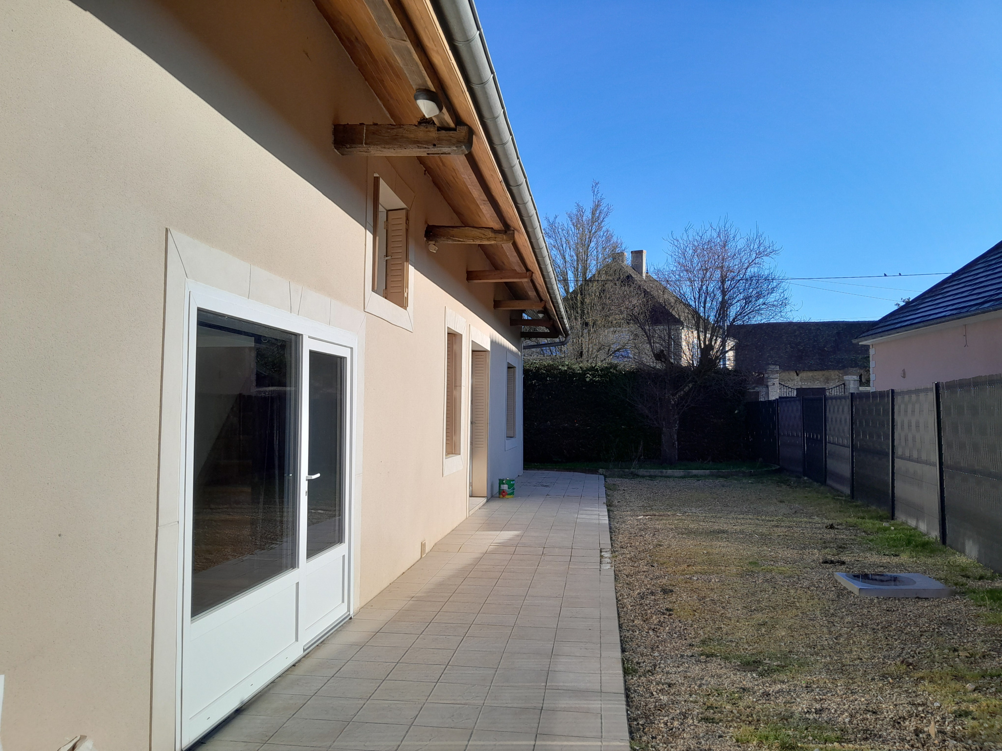L'éxtérieur se compose d'une terrasse et d'une cour gravillonnée et entiérement cloturée.